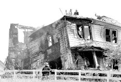County and municipal investigators examine what’s left of 55 Dey Grove Road, Manalapan, from a bucket fire truck after the house was destroyed by fire on the afternoon of May 24.