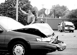 A Freehold Township police officer directs traffic around an accident involving an empty school bus and two cars Monday morning at the intersection of Halls Mill and Okerson roads. The drivers of the two cars, one of which struck the second in the rear and pushed it into the path of the bus, suffered minor injuries and were transported to CentraState Medical Center, Freehold Township, according to police. Motorists on Halls Mill Road coming from Route 33 are advised to watch out for cars turning left onto Okerson Road heading toward a new motor vehicle inspection station.