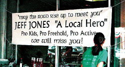 The funeral procession for Jeff Jones leaves the Court Jester, Freehold, on Thurs-day, while a sign in the window of Sweet Lew’s Cafe recalls Jones’ commitment to the community.