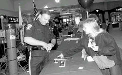 Kimberly Gliss, 10, Old Bridge, grabs a free DARE sticker from Patrolman Frank Bottiglieri during Saturday’s DARE Expo at the Brunswick Square Mall, East Brunswick. The DARE program is designed to educate children on the dangers of drug abuse.