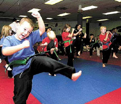 Matthew Clarke, 6, of South Brunswick, participates in a kick-a-thon held to benefit South River resident Maria Colaco who needs surgery to restore her sight. The event was held on Thursday in North Brunswick. For the story, see page 5.
