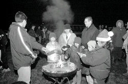 Residents gather around the fire to ward off chilly temperatures during Sunday night’s outdoor Christmas celebration at St. Bartholomew Church, East Brunswick.