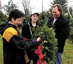 Sharon Biles, Denise Tiedman and Steve Biles look over a wreath at the Trinity United Methodist Church tree sale in Spotswood on Saturday.