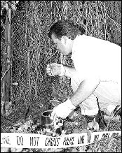 PHOTOS BY JERRY WOLKOWITZ Robert Love of Monroe shows a charred area on his property where a cross had been burned hours earlier. At right, Todd O’Malley, an arson investigator with Middlesex County, examines the site on Buckelew Avenue.