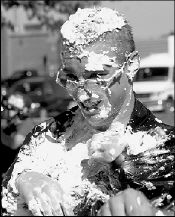 FARRAH MAFFAI Stephanie Francis, 13, throws a shaving cream pie during the South River Municipal Alliance’s Heritage Day Saturday. It would hit a good sport in South River High School junior Robert Hickey.