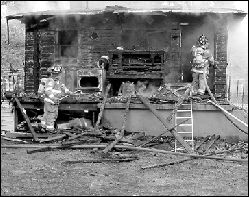 PHOTOS BY RYAN D. FENSTERMAKER Above, firefighters shoot water onto a house on Spotswood-Englishtown Road in Monroe Sunday. Two residents were injured in the blaze, and the house was destroyed. Left, firefighters work at the rear of the house.