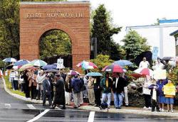 CHRIS KELLY staff Protesters like Jim Cafiero (l) took refuge under umbrellas as they stood outside Fort Monmouth in the early morning rain June 3, awaiting the arrival of BRAC commissioners. Nonetheless, Anthony J. Principi and retired U.S. Air Force Gen. Lloyd Newton, the two BRAC commissioners who toured Fort Monmouth, admitted to a courtroom full of area legislators, local leaders, fort contractors, and reporters that they were impressed with the operations they had observed on the base just hours before.