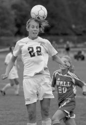 PHOTOS BY CHRIS KELLY staff At left, Freehold Boro’s Alexa Rozzi (No. 1) tries to break deep into Wall territory during a home game last week. Above, Freehold Boro’s Shannon Mayrose (No. 22) beats out Wall’s Kerry Hartnet (No. 20) during last week’s game.  |