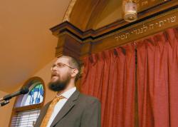 PHOTOS BY SCOTT FRIEDMAN Above: A children’s singing group sings Hanukkah songs during an event Sunday at the Chabad Jewish Center of Monroe on Gravel Hill Road. The event featured the lighting of what is billed as Monroe’s largest menorah. Left: Rabbi Eliezer Zaklikovsky addresses those present for the Hanukkah party.  |